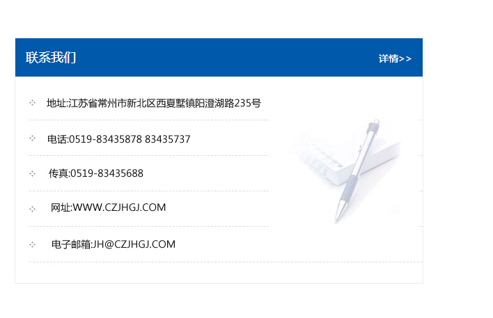 地址:常州市新北區友邦商務大廈1幢16、17層  電話:0519-85101652  傳真:0519-85112595  郵編:213022  網址:www_cz-jiayue_cn.lewaila.com  郵箱:xiajifengaa@163.com